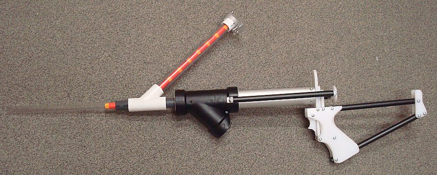 Slide the assembled plunger tube onto the Grip Assembly by feeding the Plunger Rod through it while holding the Trigger.