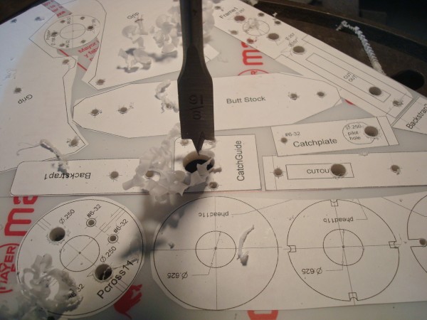 | Using a Drill Press and a 5/8" Flat Wood-boring drill bit bore out all the holes labeled "5/8". Go slowly and carefully with minimal downforce to help avoid tearing the templates off the plastic.