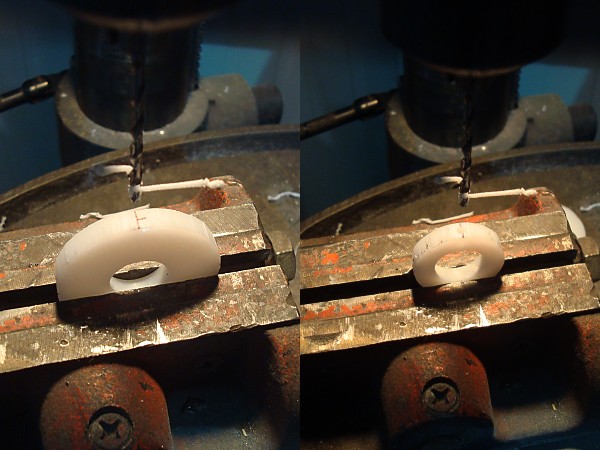 | Using a Drill Press and a 9/16" Flat Wood-boring drill bit bore out all the holes labeled "9/16". Go slowly and carefully with minimal downforce to help avoid tearing the templates off the plastic.