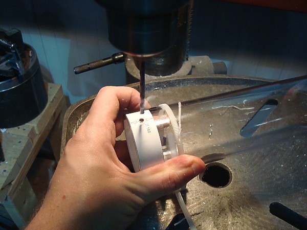Rotate the plunger tube to the next center mark and drill the next holes, then repeat the process.