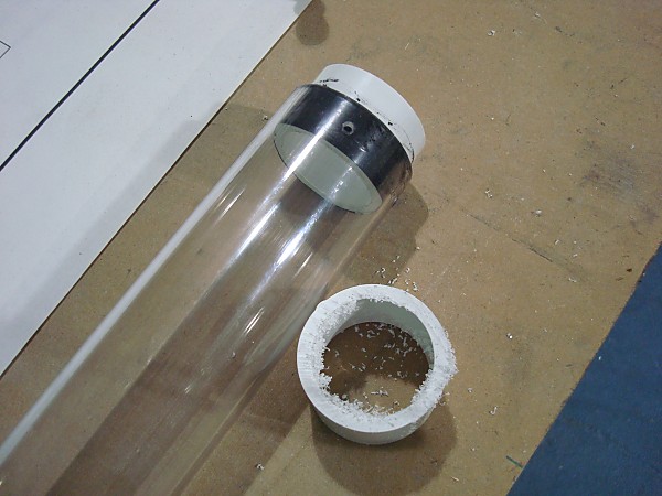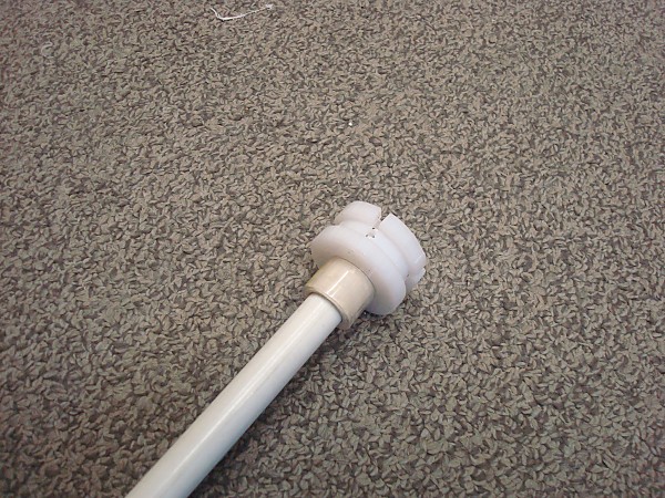 Put two wraps of e-tape around the end near the cut, then slide it into the end of the plunger tube. Tap the 1-1/4 SCH40 Bushing adapter into the coupler half.
